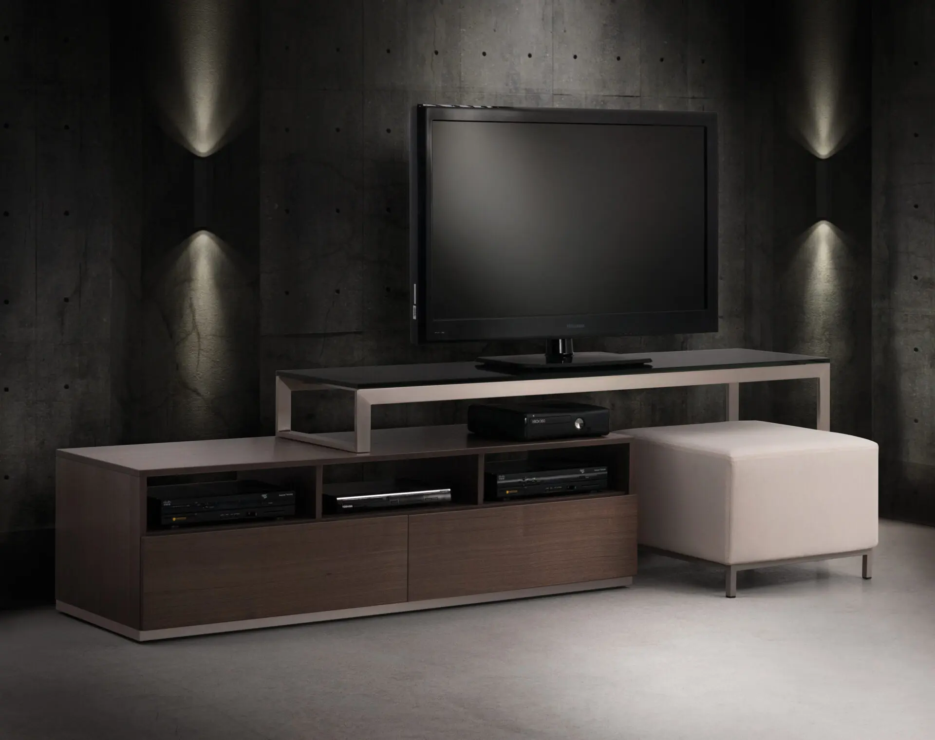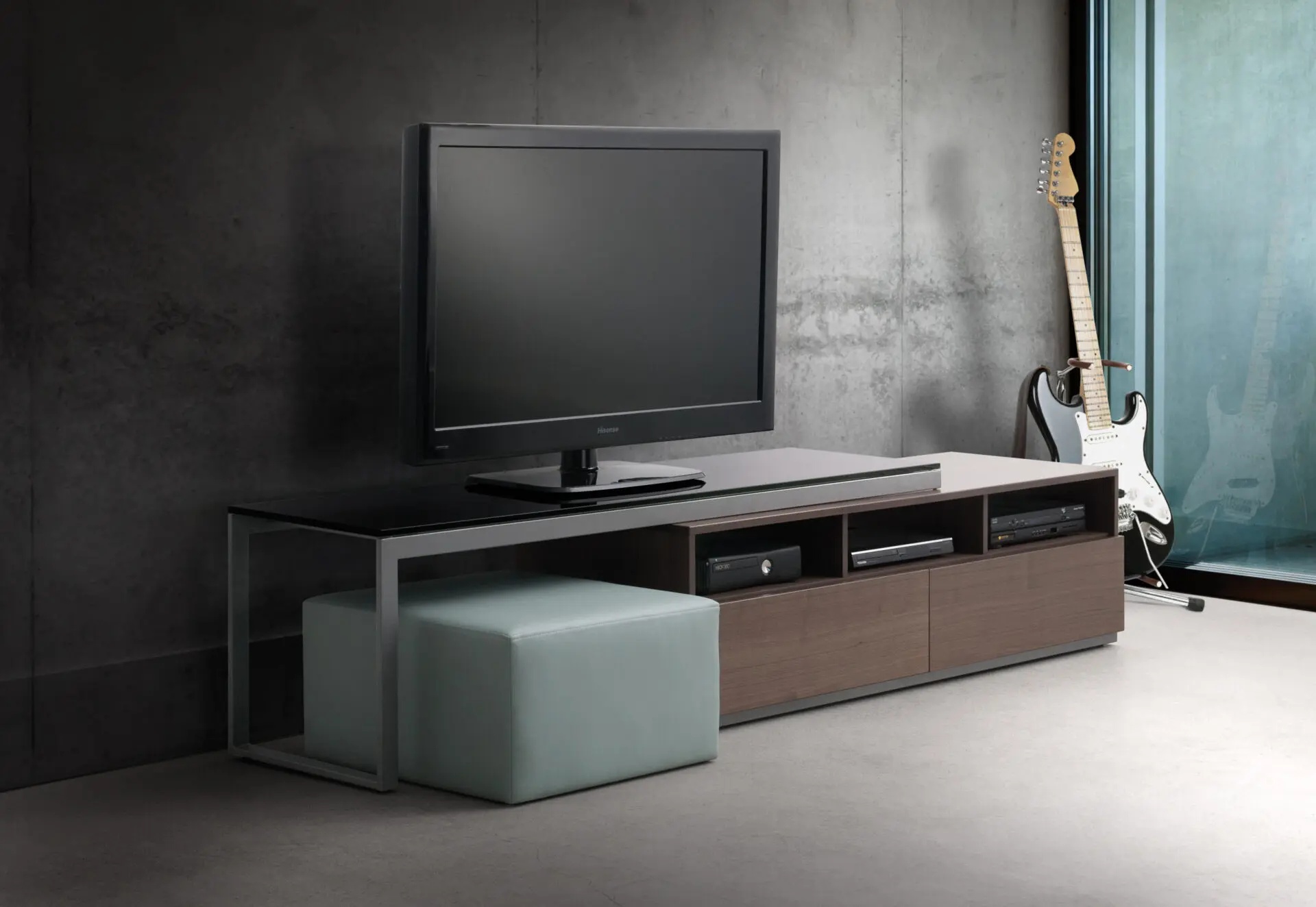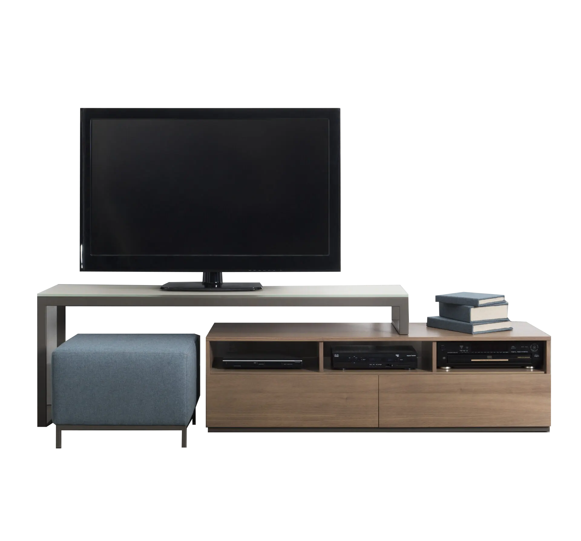 The Bô furniture piece features a durable metal frame topped with an elegant shelf available in glass, porcelain, or wood. Below, the wood veneer cabinet provides practical storage space for electronics and other items.
