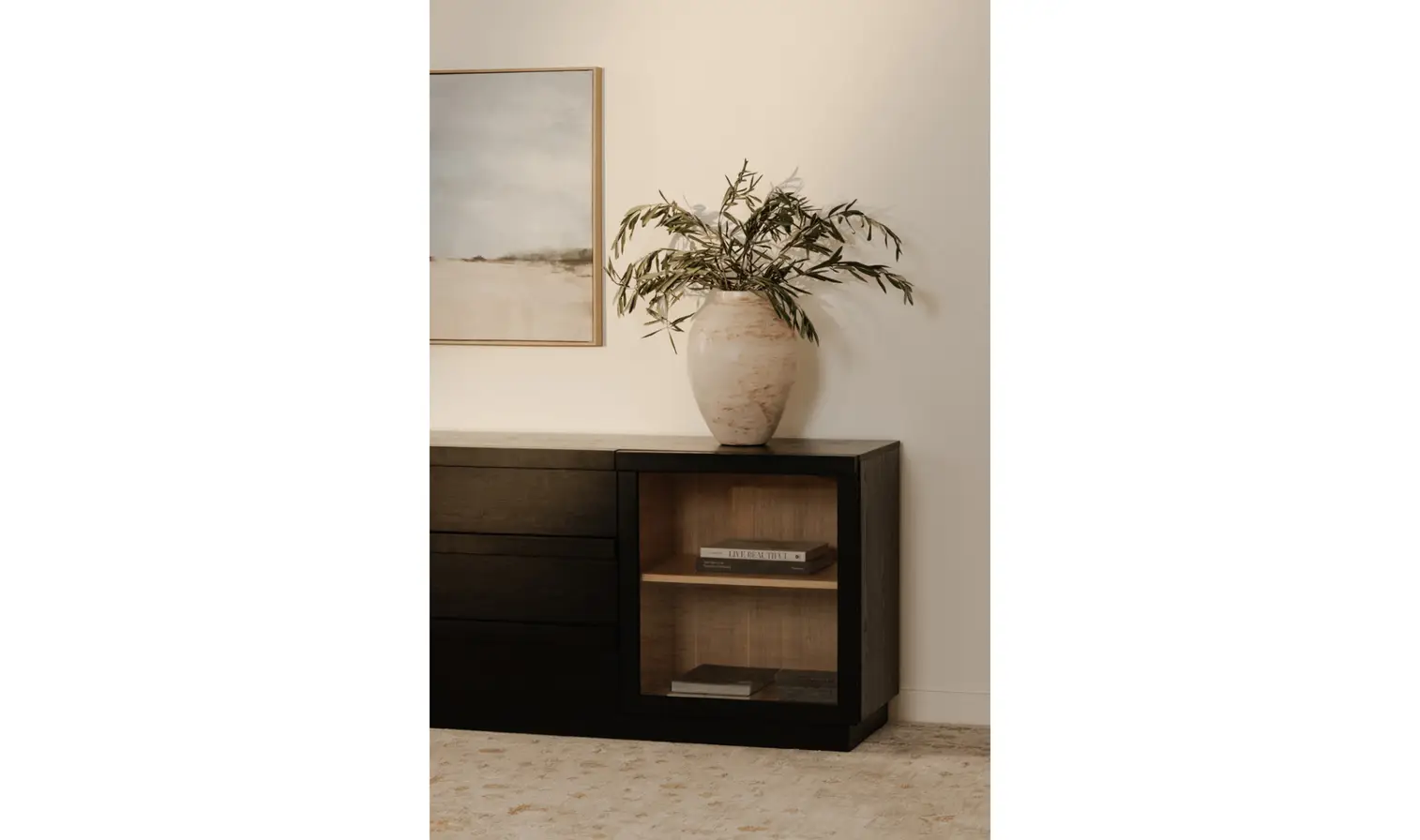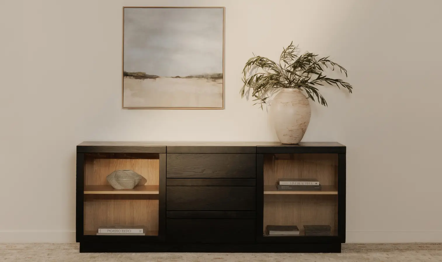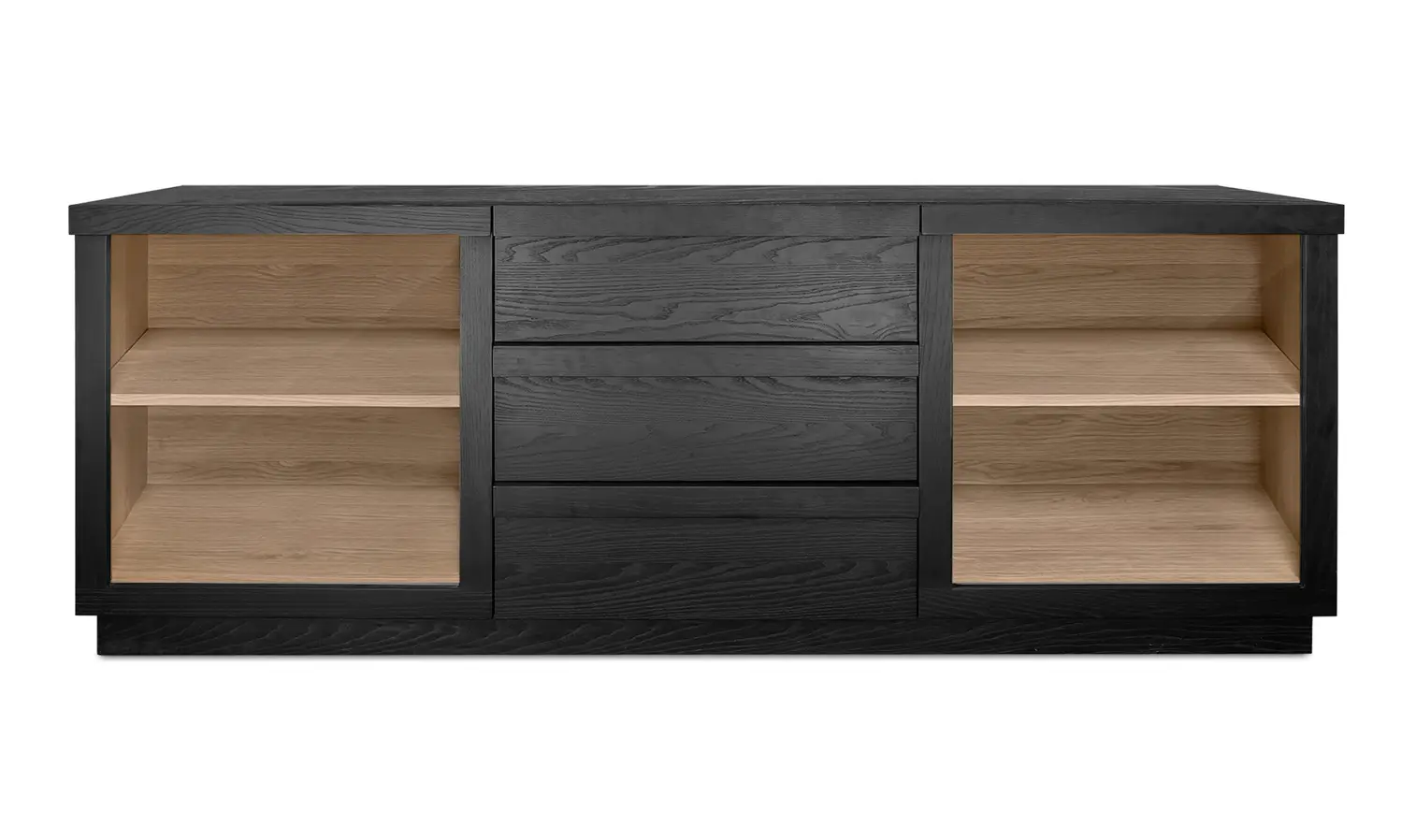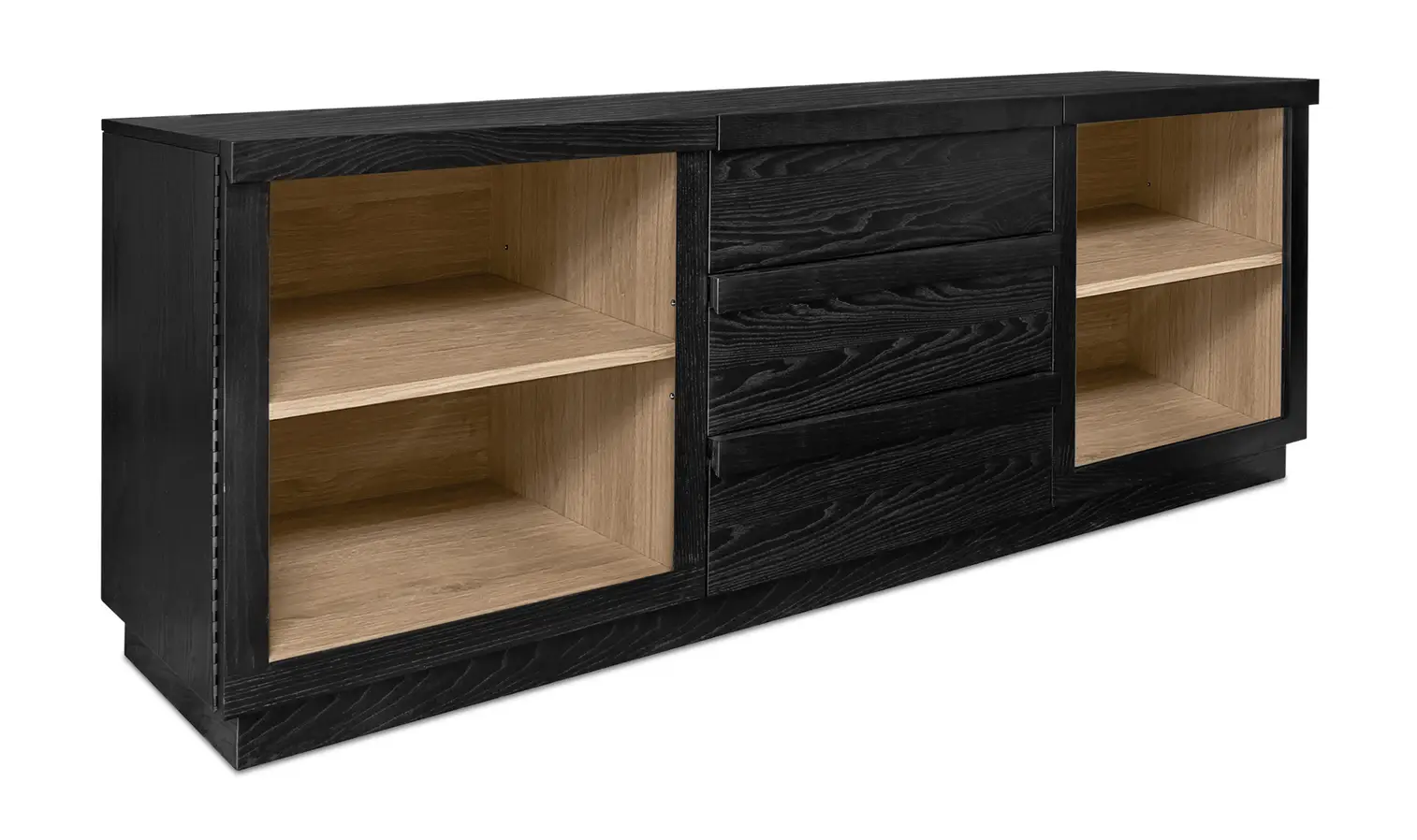 Inspired by the simple elegance of French Cleat handles, the Charlotte sideboard features a captivating two-tone design with a sleek black outer frame and natural interior. Tempered glass doors offer a stylish, protective showcase, while three interior drawers neatly store smaller belongings. With its modern and versatile design, this piece balances practical storage with graceful display.