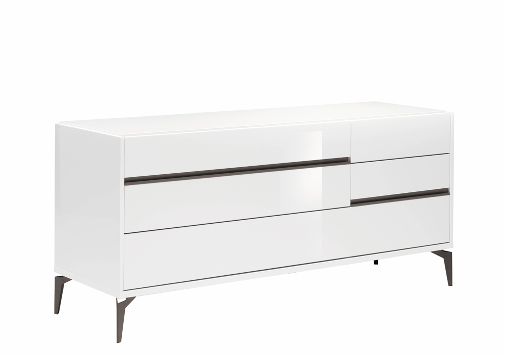 The Costablanca collection brings the lightness and purity of white to your bedroom with its fluid and functional design. It includes a bed, dresser, bedside tables, tall chest of drawers, and a mirror. The collection features metal handles and feet, with the handles flush with the carcass, seamlessly integrating into the design. The bed, available in Queen, King, and California sizes, stands out with its structured geometric design and panels that slope in different directions.
