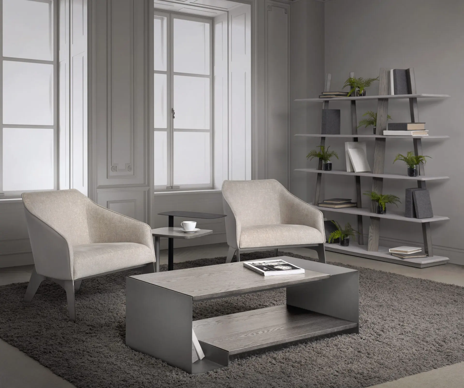 Duo offers coffee tables with a distinctive geometric design, featuring a sturdy steel base and tops made of glass, wood veneer, solid wood, or porcelain. Available in three sizes, including a console, this range is characterized by its clean and sleek lines, providing a modern and versatile aesthetic to any living space.