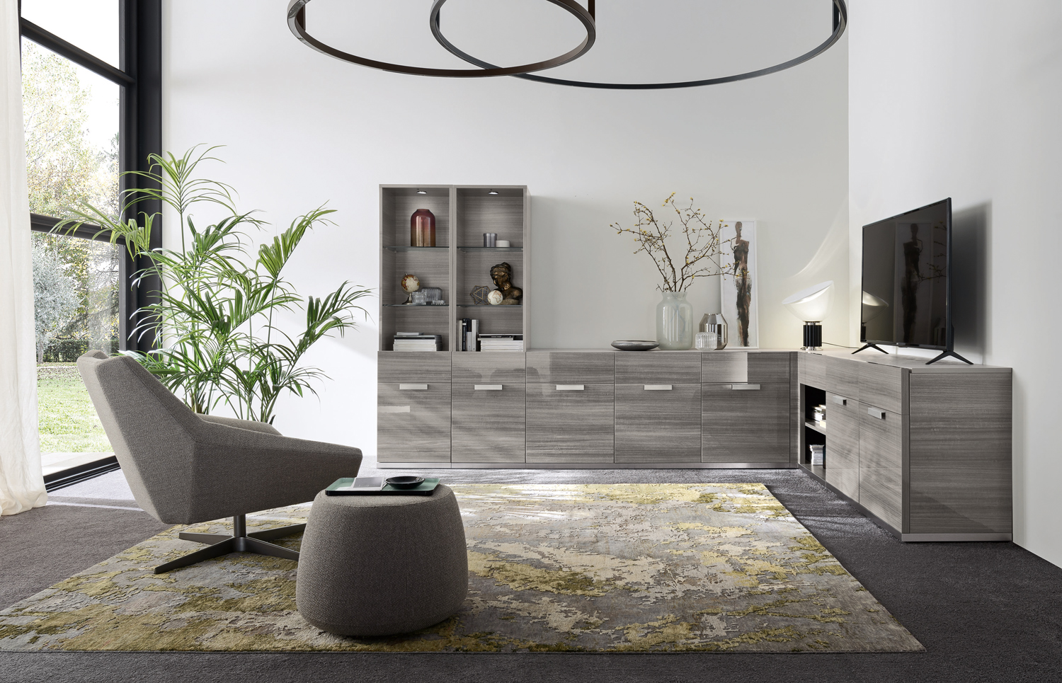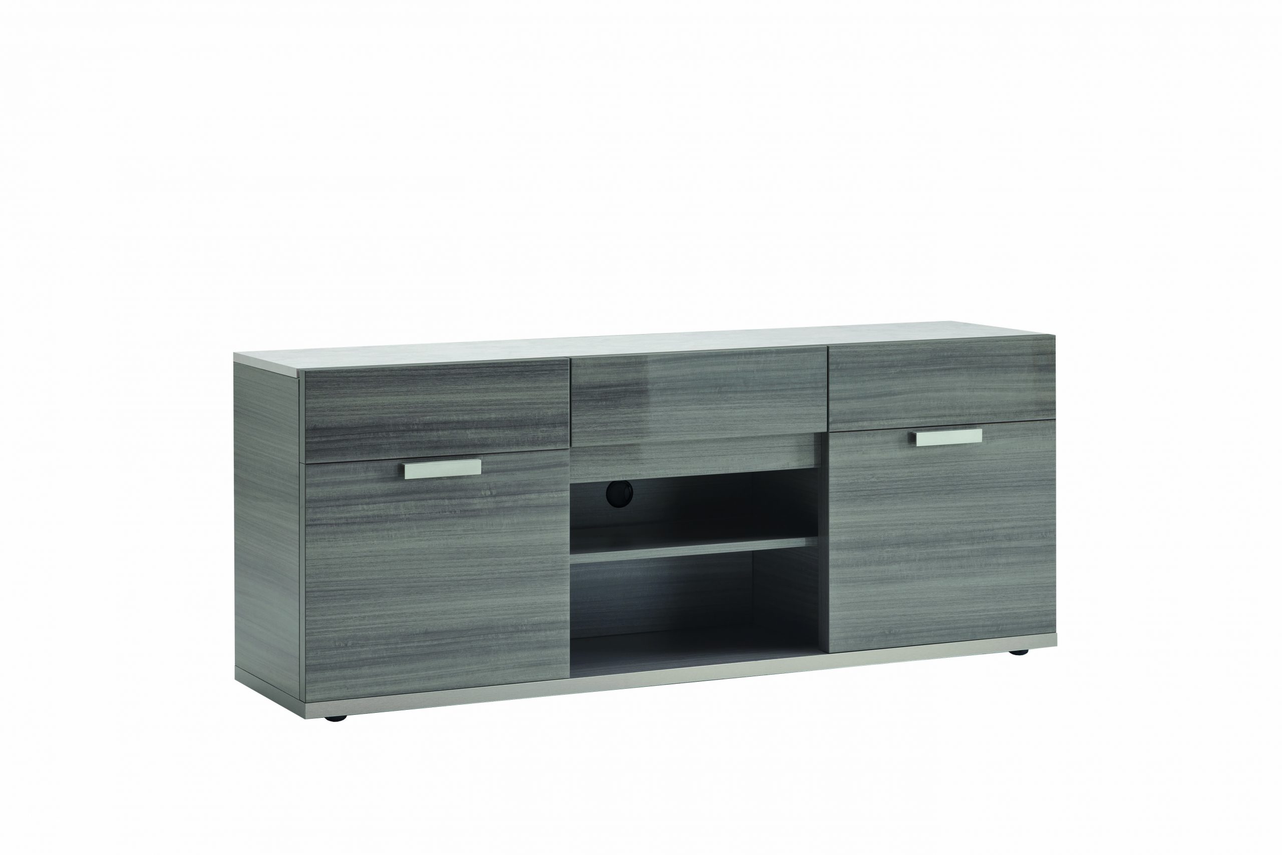Modular and modern, the Iris collection combines wood and metal with a unique cement finish. It offers a variety of configurations with a TV unit that features two doors, a drawer, and an open-front compartment, all adorned with chrome metal handles and bases.