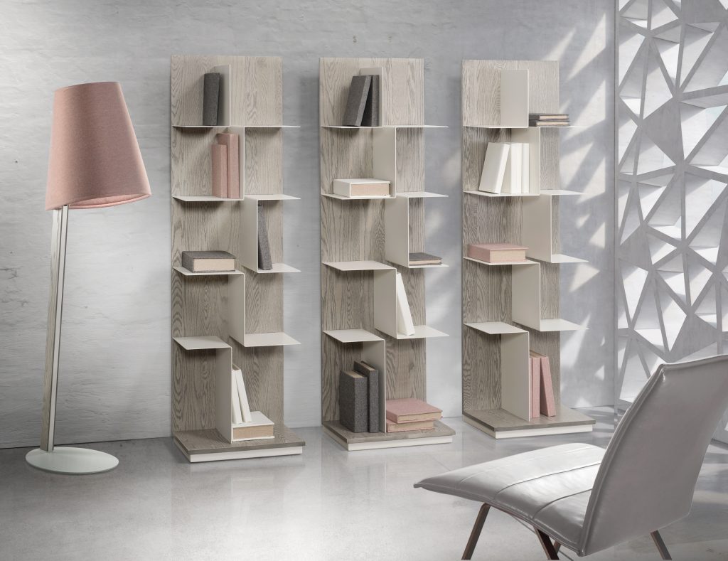 The Maze shelf is a freestanding furniture piece featuring a dynamic design with staggered shelves. Available in painted metal, it combines modern aesthetics with practical functionality, including adjustable legs and options for wood veneer or solid wood in a variety of finishes.
