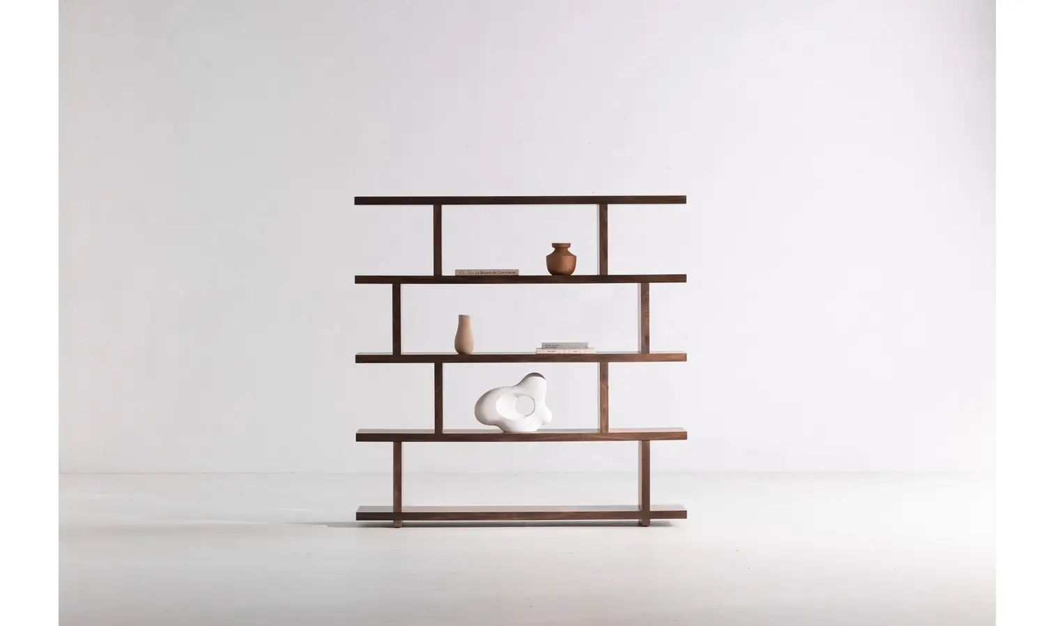The Miri shelf is a paragon of versatility and sophistication with its open concept and modern aesthetic. Available in either a high-quality walnut veneer and Oak or a striking high-gloss white lacquer, this elegant piece serves as both a tasteful space divider and an exquisite geometric bookshelf. Effortlessly slide two Miri Shelf units together to create a seamless, expanded display.