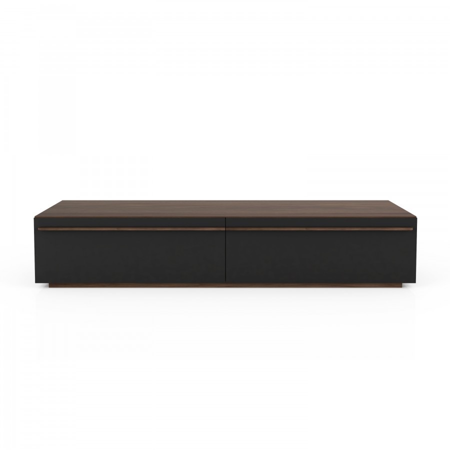 Scene is a media unit with a large back panel available in several micro textured lacquer finishes. It can be centered or aligned with the left or right end. A walnut veneer shelf attached to the back panel serves as a television stand. A sound bar or other devices can be installed under this shelf. The unit base offers ample storage space in the form of a closed compartment equipped with an adjustable shelf and drop-down door and a drawer, both sporting a black smoked glass front panel.