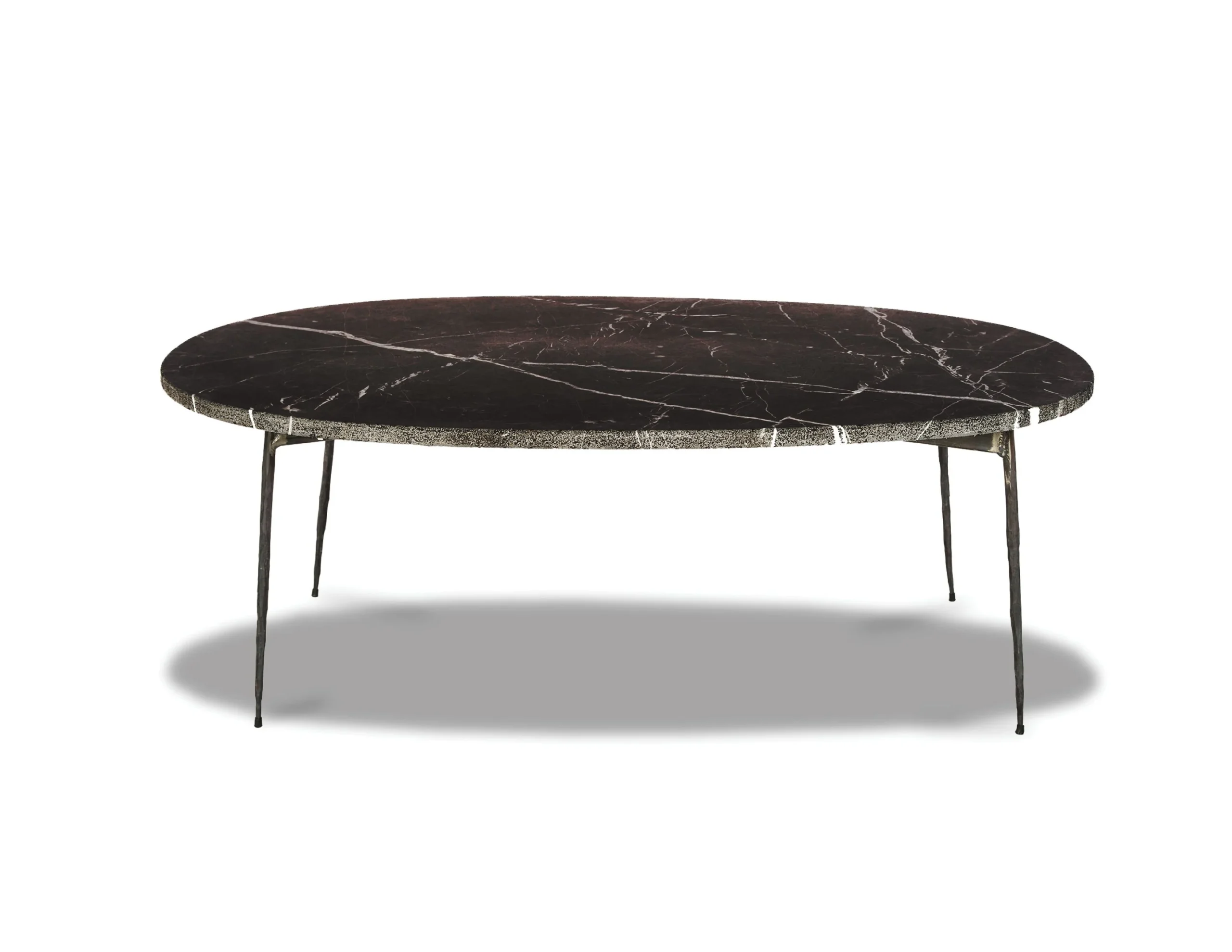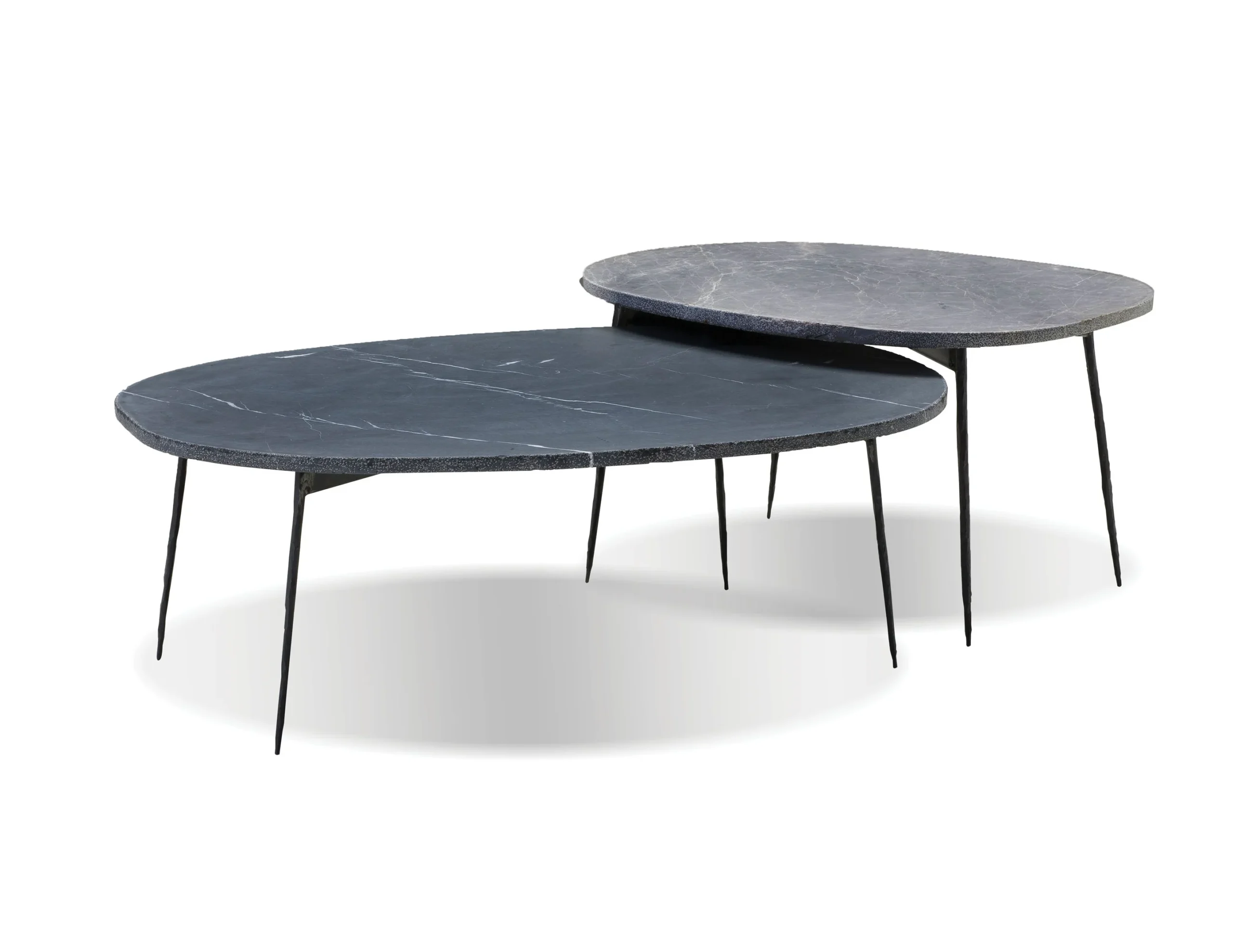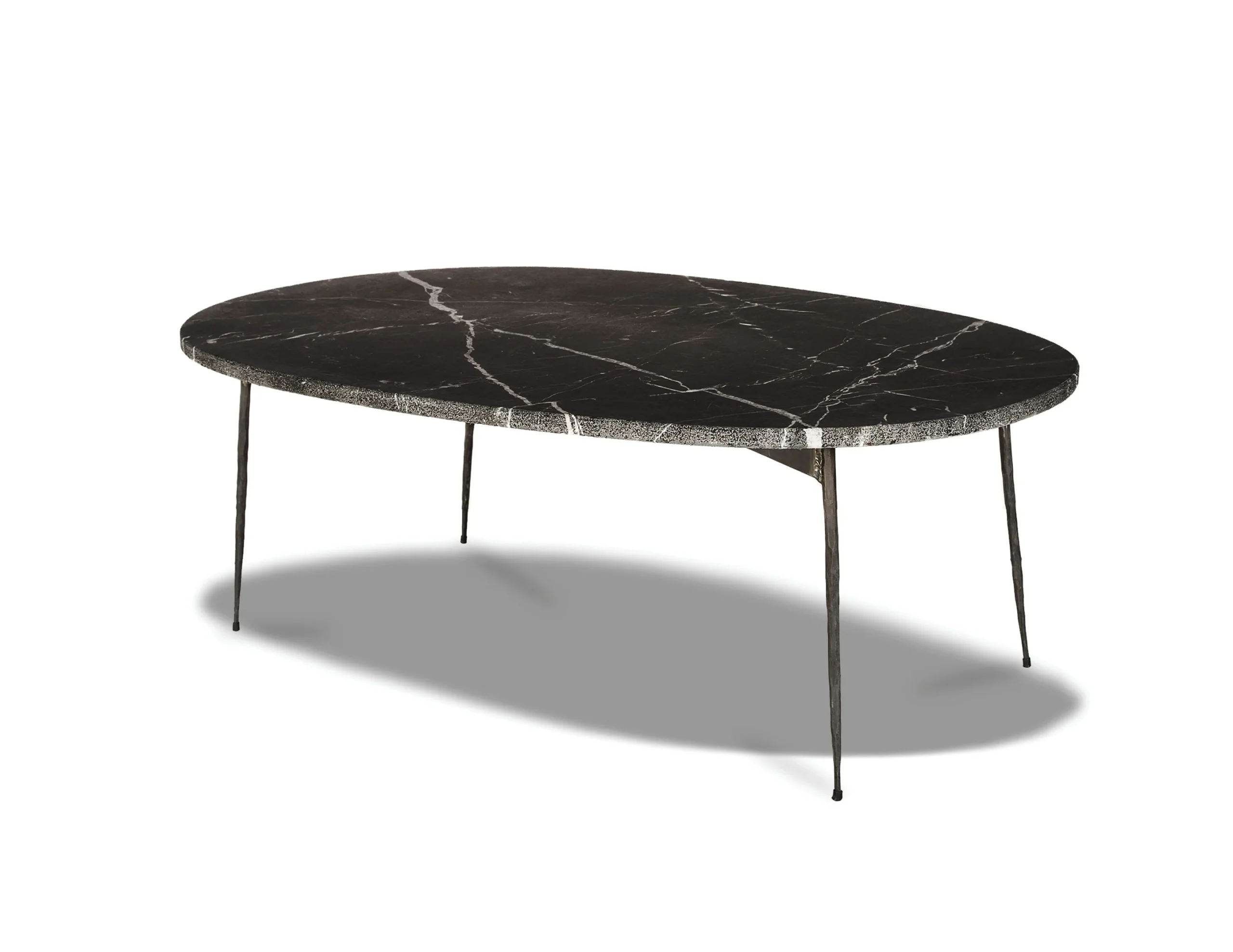 The TukTuk tables are artisanal masterpieces. The base is forged hammered steel with elegant point down. The black marquina Spanish marble has a honed finish and a natural shape, the edge detailing is sand-blasted giving the tables their handmade appearance.